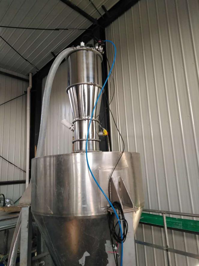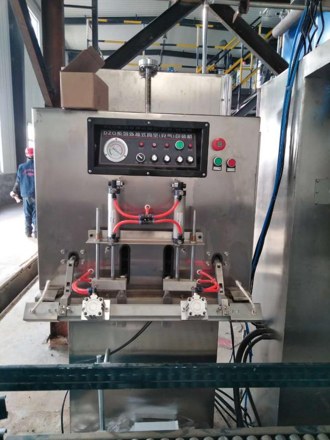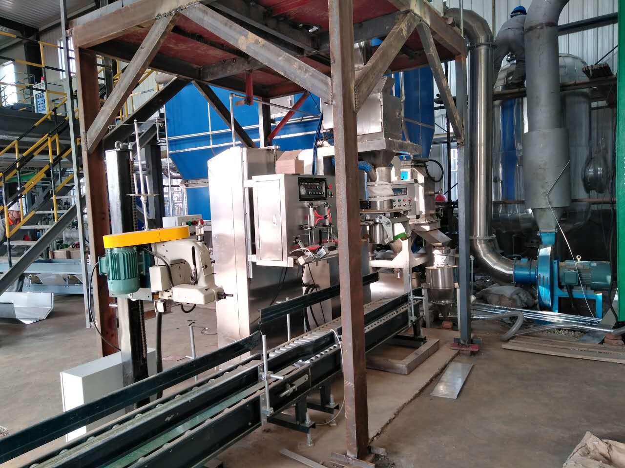 集料分配裝置接收干燥機組的出料,經(jīng)加速室由負(fù)壓氣力輸送系統(tǒng)輸送至緩存料倉,再通過分料器為包裝機供料,包裝機采用特殊夾袋機構(gòu),配合除塵系統(tǒng)避免揚塵。抽真空熱合機和縫包機對滿袋物料進(jìn)行密封封口,配合變頻皮帶輸送機協(xié)同輸送包裝袋。此套儲運、包裝系統(tǒng)在滿足用戶生產(chǎn)需要,提供自動化的同時,又大大改善了操作環(huán)境。受到客戶的高度贊揚。