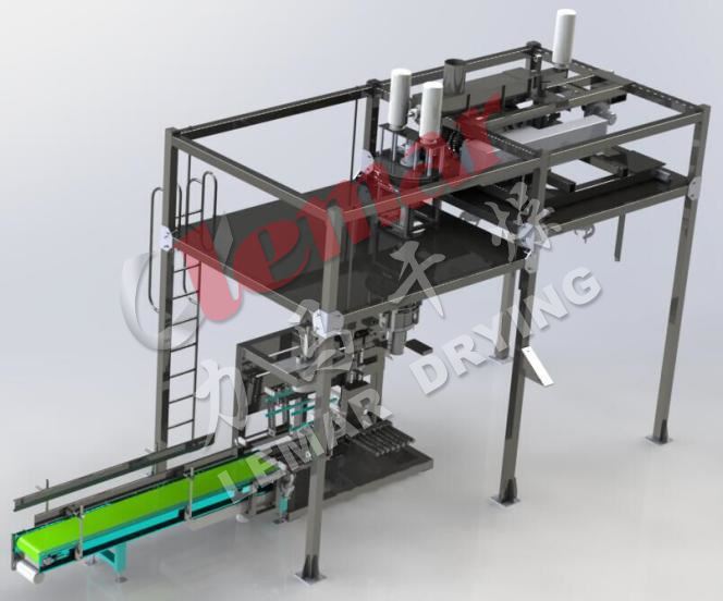 系統(tǒng)由雙向分料螺旋通過變頻控制為為大、小包裝供料。大包裝采用垂直加料螺旋喂料,集成高低速加料、電動升降、抖包、空袋吹氣、全密封夾袋器等裝置,有效解決包裝速度及精度要求,緩釋技術(shù)防止落袋揚塵;小包裝包含分散破拱料斗、加料集成裝置、垂直喂料機構(gòu)、升降夾袋裝置、浮動關(guān)料閥門、稱重裝置及電氣控制系統(tǒng)。保證其包裝速度和精度,改善稱重包裝時的粉塵污染問題。配套拖袋牽引脫氣系統(tǒng)、縫包貼邊熱合機在稱重加料完畢后實現(xiàn)滿袋的自動牽引并抽氣,熱合封口。金檢機、重檢機對已封口的滿袋物料進行金屬檢測和重量檢測。